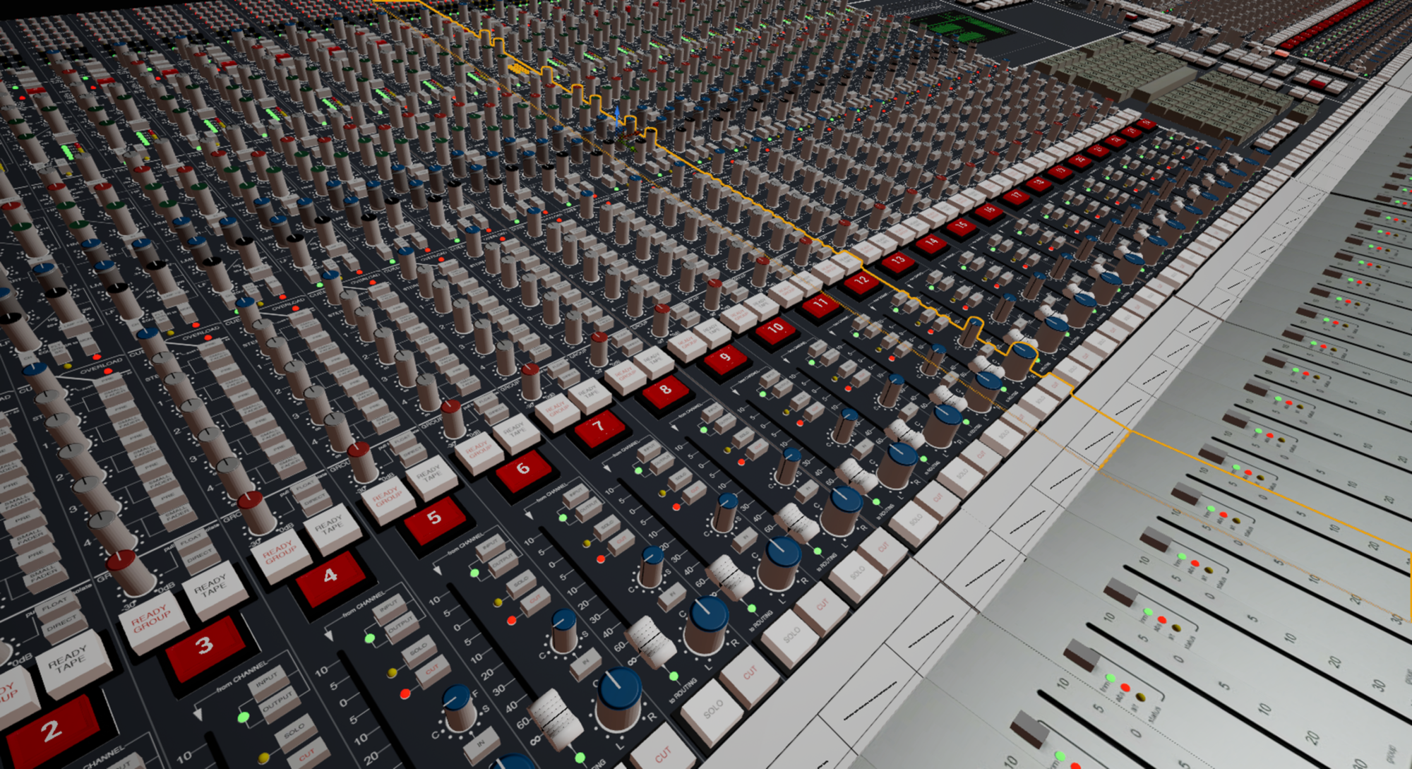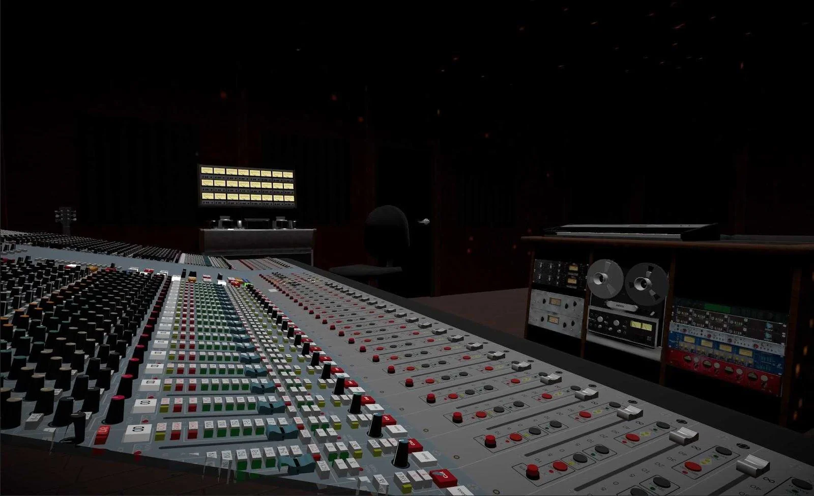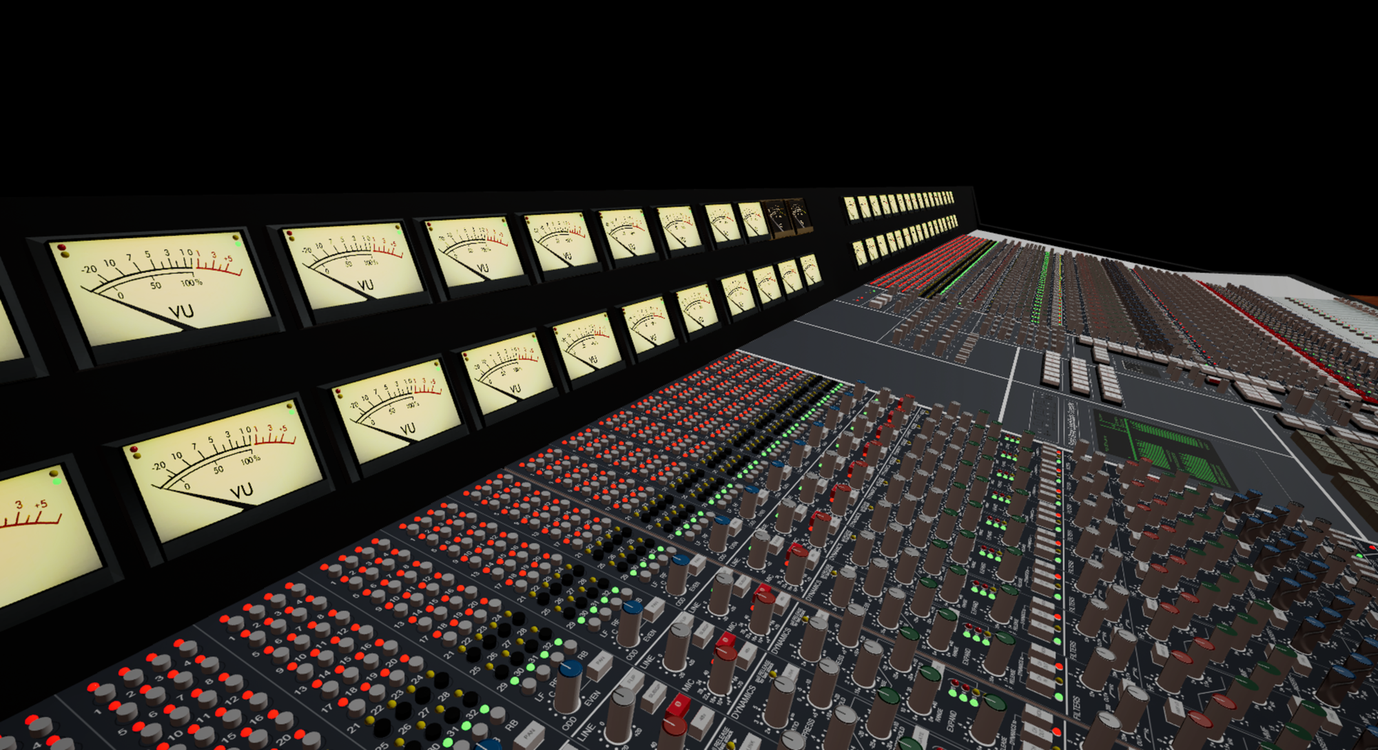 Reworked a lot of stuff on the console and added compression, filters, aux sends on each channel just because the every button in sight should function like it should to make it feel real. Added equipment and functions like reverb, delay, flashing lights. On the scribble strips with color you can write track info on each channel, which makes it at least 2x as cool as before.
